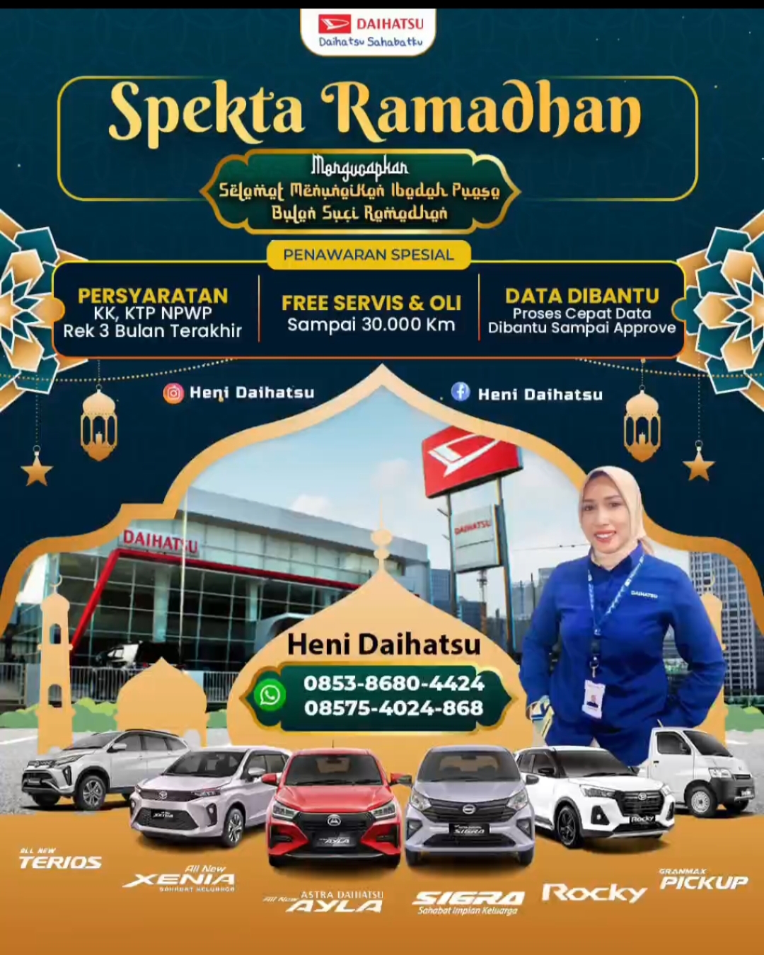 Program “Spekta Ramadhan” berlaku untuk berbagai pilihan kendaraan unggulan Daihatsu, di antaranya All New Terios, All New Xenia, Astra Daihatsu Ayla, Sigra, Rocky, hingga Gran Max Pick Up, yang dikenal tangguh, irit, dan sesuai dengan kebutuhan keluarga maupun usaha.