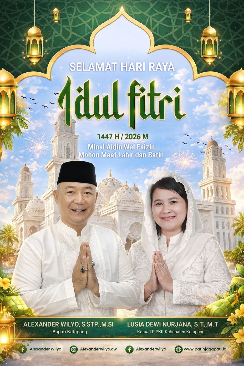 Ketapang – Dalam rangka menyambut Hari Raya Idulfitri 1 Syawal 1447 H, Bupati Ketapang, Alexander Wilyo, bersama Ketua TP PKK Kabupaten Ketapang, Lusia Dewi Nurjana, menyampaikan ucapan selamat sekaligus pesan penuh makna kepada masyarakat.