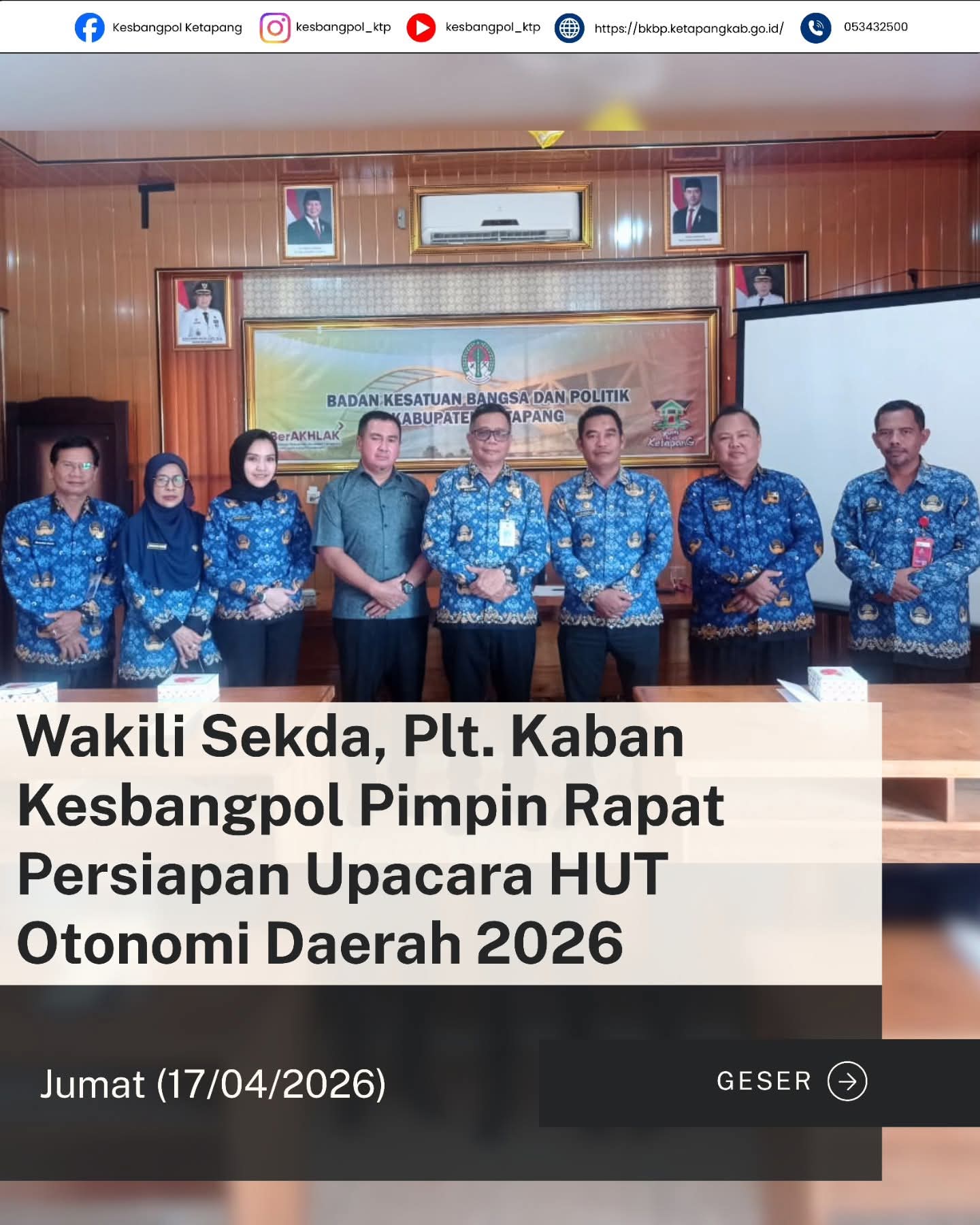 KETAPANG – Plt. Kepala Badan Kesatuan Bangsa dan Politik Kabupaten Ketapang, H. Matjuni, S.AP., M.E., mewakili Sekretaris Daerah Kabupaten Ketapang memimpin rapat persiapan Upacara Hari Ulang Tahun (HUT) Otonomi Daerah Tahun 2026 yang dilaksanakan di Ruang Rapat Kantor Kesbangpol Ketapang, Jumat, (17/04/2026).